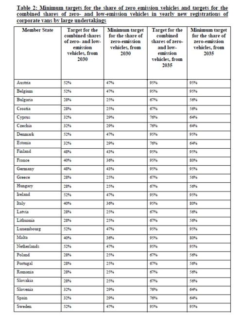 Για την Ελλάδα το ελάχιστο ποσοστό των αμιγώς ηλεκτρικών van από το 2030 ανέρχεται σε 25% ενώ ο συνδυασμός αμιγώς ηλεκτρικών ΙΧ με οχήματα χαμηλών εκπομπών ανέρχεται σε 28%.