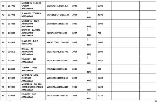 Το φθηνότερο αυτοκίνητο της δημοπρασίας είναι μία Skoda Fabia σε station αμάξωμα, με κινητήρα βενζίνης και έτος κατασκευής το 2000, με την τιμή εκκίνησης να ανέρχεται σε 400 ευρώ.