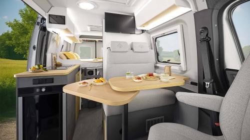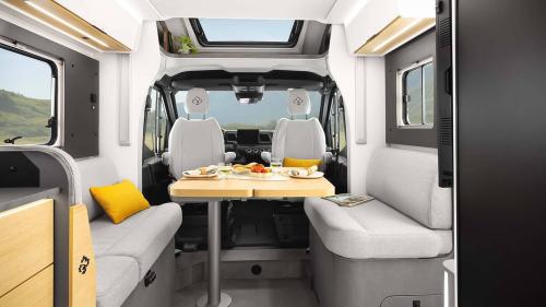 Ξεχωρίζει η face-to-face τραπεζαρία, που θυμίζει κανονικό σαλόνι, καθώς και το extra wide αναδιπλούμενο κρεβάτι πάνω από το καθιστικό, διαστάσεων 200 x 150 εκατοστών, επίσης στον βασικό εξοπλισμό.