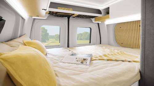 Ξεκινώντας από το Ahorn Camp CV 56, το συνολικό μήκος του διαμορφώνεται στα 5,68 μέτρα, ενώ διαθέτει δύο σταθερά κρεβάτια, έξυπνα σχεδιασμένο χώρο αποσκευών και σύστημα smart home στον βασικό εξοπλισμό. Το μόνιμο εγκάρσιο κρεβάτι στο πίσω μέρος, με κανονικό σομιέ, μπορεί να αναδιπλωθεί εύκολα, μετατρέποντας τον χώρο σε μεγάλο «γκαράζ» για ποδήλατα, σανίδες ή ογκώδη εξοπλισμό. Η πρόσβαση παραμένει εύκολη χάρη στο αφαιρούμενο προστατευτικό φόρτωσης, ακόμη και όταν ο χώρος είναι πλήρως γεμάτος.