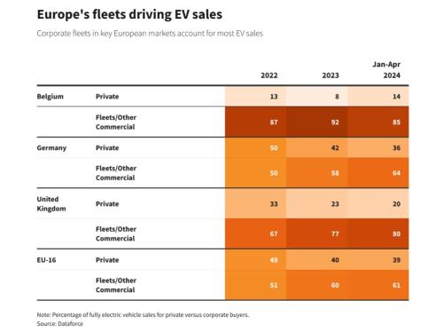 Σύμφωνα με στοιχεία που παρείχε στο Reuters η Dataforce, στις 16 ευρωπαϊκές αγορές όπου μπορεί να εντοπίσει ταξινομήσεις στόλων - συμπεριλαμβανομένων της Γερμανίας, της Βρετανίας, της Γαλλίας και της Ισπανίας - το 60% των νέων ηλεκτρικών οχημάτων προορίζονται για εταιρικούς στόλους και εμπορικούς αγοραστές. Οι ειδικοί λένε ότι αυτοί οι αγοραστές χρησιμοποιούν σχεδόν αποκλειστικά μισθώσεις και περίπου οι μισές από τις υπόλοιπες πωλήσεις σε ιδιώτες αγοραστές είναι επίσης μισθώσεις.