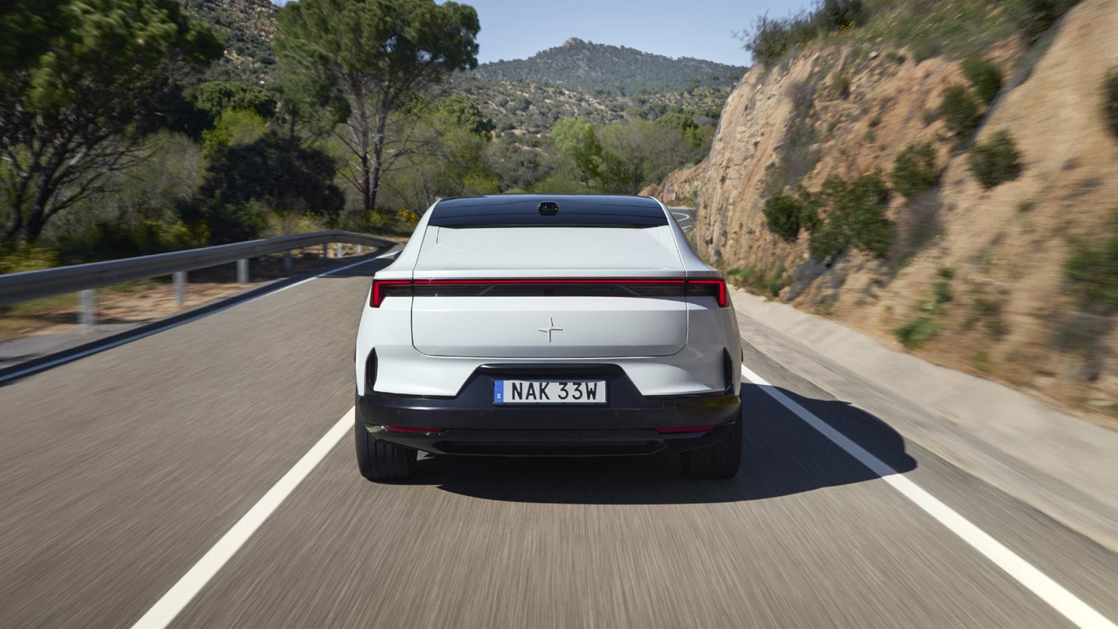 Το πίσω μέρος είναι πλήρως κλειστό, με οριζόντια στοιχεία σχεδίασης ενσωματωμένα στο κάτω τμήμα της ουράς. Η οροφή ρέει καθαρά προς τα πίσω χωρίς οπτικό σπάσιμο, και οι κάμερες χειρίζονται όλη την ορατότητα προς τα πίσω, όπως ακριβώς και στο Polestar.