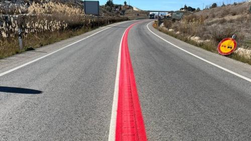 Μια νέα κόκκινη γραμμή τοποθετείται στο κέντρο του δρόμου -πάνω από τη διπλή διαχωριστική γραμμή- σε επικίνδυνα τμήματα, όπου η τρέχουσα σήμανση είναι ανεπαρκής.