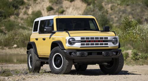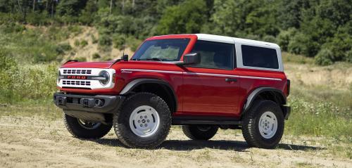 Στο Bronco του 2023, οι εκδόσεις Heritage διακρίνονται από τη διχρωμία που τους χαρίζει η λευκή Oxford White οροφή, καθώς και οι ζάντες 17 ιντσών, η λευκή λωρίδα που διατρέχει τις πλευρές και η γρίλια - όλα στο ίδιο χρώμα. Η τελευταία διαθέτει το κέντρο της τη μεγάλη κόκκινη γραμματοσειρά της FORD.