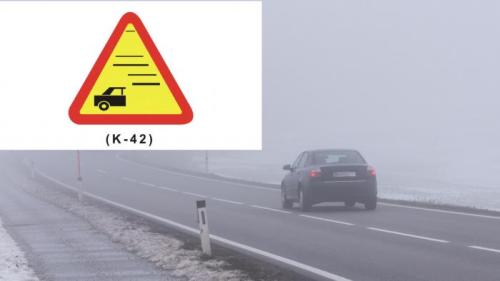 Αρχικά να αναφέρουμε ότι το συγκεκριμένο σήμα ανήκει στην οικογένεια των πινακίδων αναγγελίας κινδύνου (Κ), όπως υποδηλώνει και το τριγωνικό τους σχήμα. Στο κέντρο της πινακίδας υπάρχει… μισό αυτοκίνητο, αλλά και κάποιες οριζόντιες γραμμές που συνδυαστικά υποδηλώνουν ότι το ΙΧ εισέρχεται σε περιβάλλον που οι συνθήκες ορατότητας είναι μειωμένες.