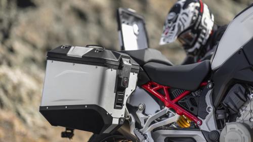 Με την ευκαιρία η ιταλική εταιρεία ανακοίνωσε και την προσθήκη στον κατάλογο των επίσημων αξεσουάρ της Multistrada V4, την προσθήκη του αλουμινένιου τριβάλιτσου, το οποίο σχεδιάστηκε σε συνεργασία με τη Givi και προσφέρει συνολικά 117 λίτρα αποθηκευτικών χώρων -76 λίτρα για τις πλαϊνές βαλίστες και 41 λίτρα για το top case. Στην πρακτικότητα έρχονται να προστεθούν οι εσωτερικές τσάντες που φέρουν οι βαλίτσες και είναι διαθέσιμες προαιρετικά.