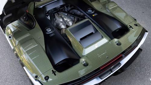 Στο πίσω μέρος, το γνώριμο σχέδιο της αεροτομής επιστρέφει, ενώ ο κινητήρας παραμένει ορατός κάτω από σχισμές από φιμέ Lexan, όπως ακριβώς και στη F40, όπου φαινόταν ο εμβληματικός V8.