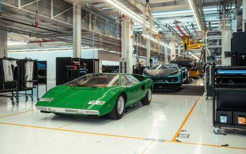 Στον ίδιο ακριβώς χώρο όπου ξεκίνησε τον Μάρτιο του 1974 η μαζική παραγωγή της Countach, στο εργοστάσιο της Lamborghini στη Sant’ Agata Bolognese, τώρα το πρώτο αντίτυπό της που κατασκευάστηκε τότε -μια πράσινη Countach LP 400- ήρθε για να συναντήσει τον απόγονό της, Revuelto.