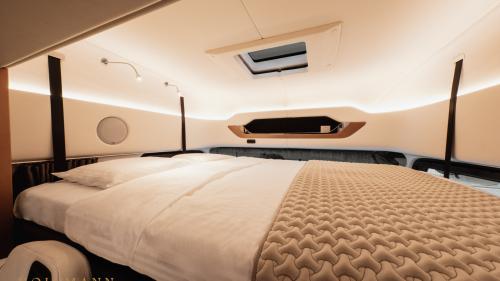 Οι δερμάτινες και ξύλινες επενδύσεις, τα πολυτελή ιταλικά έπιπλα και τα ποιοτικά πλακάκια δημιουργούν μια ιδιαίτερα premium ατμόσφαιρα, ενώ η πανοραμική οροφή διαθέτει μεταβαλλόμενη σκίαση, επιτρέποντας στο φως να προσαρμόζεται ανάλογα με τη διάθεση του επιβάτη.