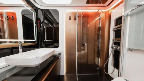 Το μπάνιο του camper δεν έχει τίποτα να ζηλέψει από δωμάτιο πολυτελούς ξενοδοχείου, αφού είναι επενδεδυμένο με μάρμαρο, διαθέτει χώρο πλυσίματος, στεγνωτήρα πετσετών και ακόμη και πλυντήριο ρούχων.