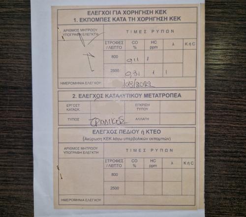 Επιτήδειος ιδιοκτήτης συνεργείου σκάναρε και εκτύπωσε μια παλιά Κάρτα Ελέγχου Καυσαερίων σε μια κόλλα Α4, την δίπλωσε στην μέση και την έπιασε με συραπτικό ώστε να μην ανοίγει και ετοίμασε μια απίστευτη αλλά Ελληνική Κάρτα Ελέγχου Καυσαερίων στην οποία οι τιμές αναγράφονται χειρόγραφα!