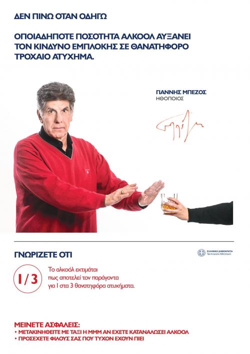 Ο καταξιωμένος ηθοποιός Γιάννης Μπέζος μεταφέρει το πάντα επίκαιρο μήνυμα που θέλει το αλκοόλ και την οδήγηση να αποτελούν δύο ασύνδετες έννοιες, κάτι που βασίζεται στα στοιχεία που καταδεικνύουν ότι ένα στα τρία θανατηφόρα τροχαία ατυχήματα οφείλεται στην κατανάλωση αλκοόλ από εμπλεκόμενο οδηγό.