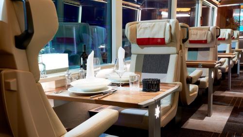 Πέρα από το φυσικό περιβάλλον, το ίδιο το τρένο προσφέρει μια αυστηρά premium εμπειρία που αντανακλά την πολυτέλεια των αλπικών θερέτρων.
