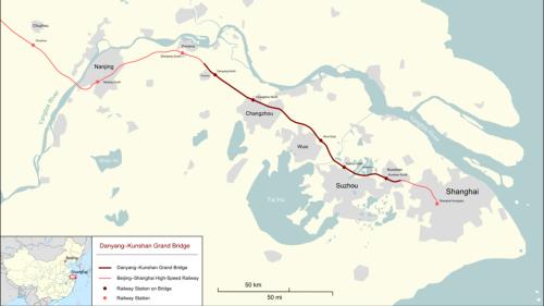 Η πορεία της περνά από την Danyang και συνεχίζει μέσα από τις πόλεις Changzhou, Wuxi, Suzhou, φτάνοντας μέχρι το Kunshan. Εντυπωσιακότερο όλων είναι το τμήμα πάνω από τη λίμνη Yangcheng, όπου η κατασκευή στηρίζεται σε περίπου 2.000 πυλώνες και εκτείνεται σε μήκος 9 χιλιομέτρων. Για να ολοκληρωθεί χρειάστηκαν 450.000 τόνοι χάλυβα, ενώ ο σχεδιασμός επιτρέπει την ανεμπόδιστη διέλευση πλοίων κάτω από τα ανοίγματα.