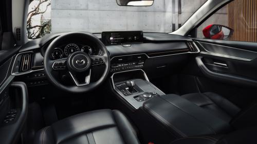 Παρά το μεγάλο μέγεθος του CX-60, η θέση οδήγησης δείχνει να προσφέρει σωστή εποπτεία τουλάχιστον προς τα εμπρός, ενώ η Mazda έχει φροντίσει με τη σχεδίαση του καπό να δείχνει τα όρια του αυτοκινήτου στον οδηγό με φυσικό τρόπο. Για την πληροφόρηση του οδηγού φροντίζει ένας μεγάλος πίνακας-οθόνη με διαγώνιο στις 12,3 ίντσες όση είναι και η διαγώνιος της κεντρικής οθόνης του συστήματος πολυμέσων. Το τελευταίο ελέγχεται από το μεγάλο πιεζοπεριστροφικό χειριστήριο τοποθετημένο ανάμεσα στα δύο καθίσματα και μας είναι γνωστό για την ευκολία που προσφέρει στον οδηγό και από άλλα μοντέλα των Ιαπώνων, ενώ πολύ καλά επίπεδα βρίσκεται και η γενικότερη εργονομία του CX-60.
