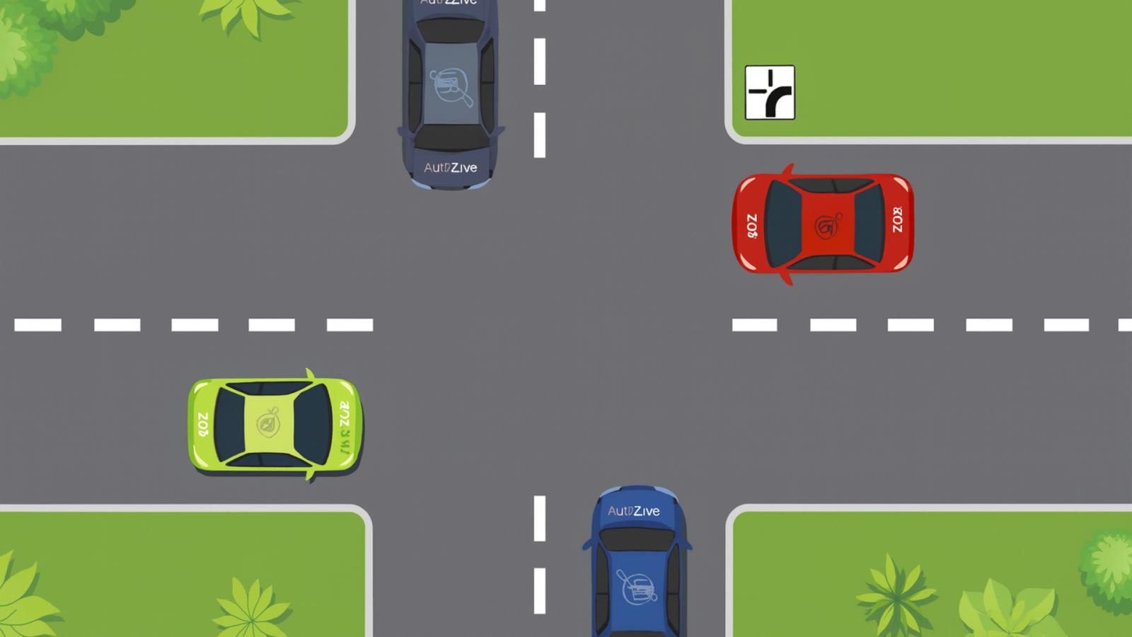 Έτσι, το μπλε αυτοκίνητο «χάνει» το δικαίωμα να περάσει πρώτο, ενώ το γκρι και το πράσινο, που έρχονται από δευτερεύουσες οδούς, οφείλουν ούτως ή άλλως να περιμένουν. Η προτεραιότητα, λοιπόν, κρίνεται ανάμεσα στο κόκκινο και το μπλε, με τον κανόνα «προτεραιότητα από δεξιά» να δίνει το προβάδισμα στο κόκκινο.