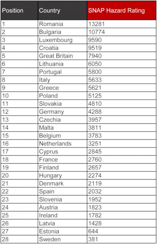 Έπειτα από ανάλυση των δεδομένων που σχετίζονται με τροχαία ατυχήματα στους ευρωπαϊκούς δρόμους, σε συνδυασμό με τον αριθμό των θανατηφόρων τροχαίων, η SNAP αξιολόγησε τους αυτοκινητόδρομους με βάση τον αριθμό των θανάτων ανά 10.000 μίλια (16.093 χλμ).