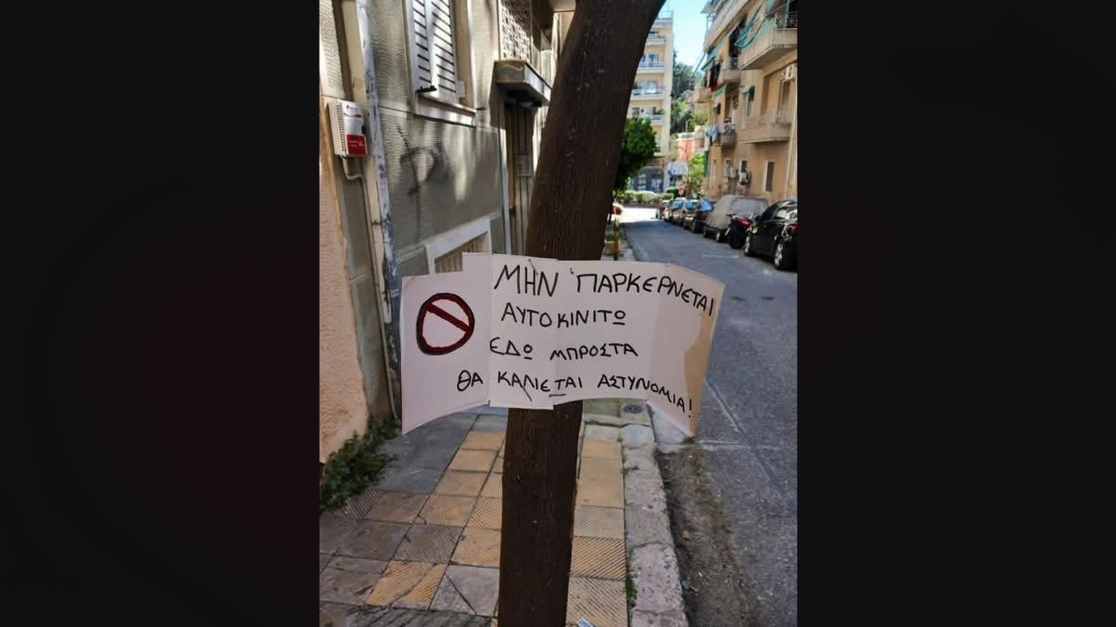 Χρησιμοποιώντας μια κόλλα Α4 την οποία σύρραψε πάνω στον κορμό ενός δέντρου, ο γείτονας προέβη στις απαραίτητες συστάσεις, καθώς και στην προτροπή των οδηγών να μη σταθμεύουν στο σημείο που τους υποδεικνύεται, καθώς σε διαφορετική περίπτωση θα καλείται η αστυνομία.