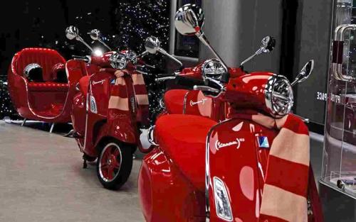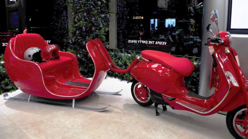 Η Piaggio δημιούργησε τη Vespa Slitta Babbo Natale, ένα εντυπωσιακό έλκηθρο σε έντονο κόκκινο χρώμα, το οποίο αντί για τάρανδους το σέρνουν πέντε ολοκαίνουργιες Vespa Primavera RED Elettrica - στοιχείο που αποκαλύπτει τον σύγχρονο και οικολογικό χαρακτήρα της ιδέας.