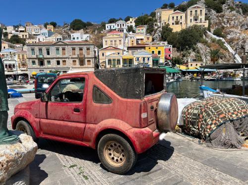 Το Jimny πρώτης γενιάς που απαθανατίσαμε στο λιμάνι της γραφικής Σύμης τις προηγούμενες μέρες ανήκει σε ιδιώτη και σύμφωνα με την πραγματική του εικόνα θα μπορούσε να διεκδικήσει τον τίτλο του πιο «Ταλαιπωρημένου Suzuki» σε παγκόσμιο επίπεδο. Εκτός της πολυεστερικής μαύρης προσθήκης που του έχει αφαιρέσει τον κάμπριο χαρακτήρα του, τα σημάδια του χρόνου και η διάβρωση από τη θάλασσα είναι κάτι περισσότερο από ορατά.