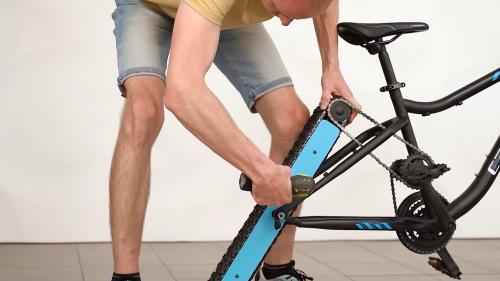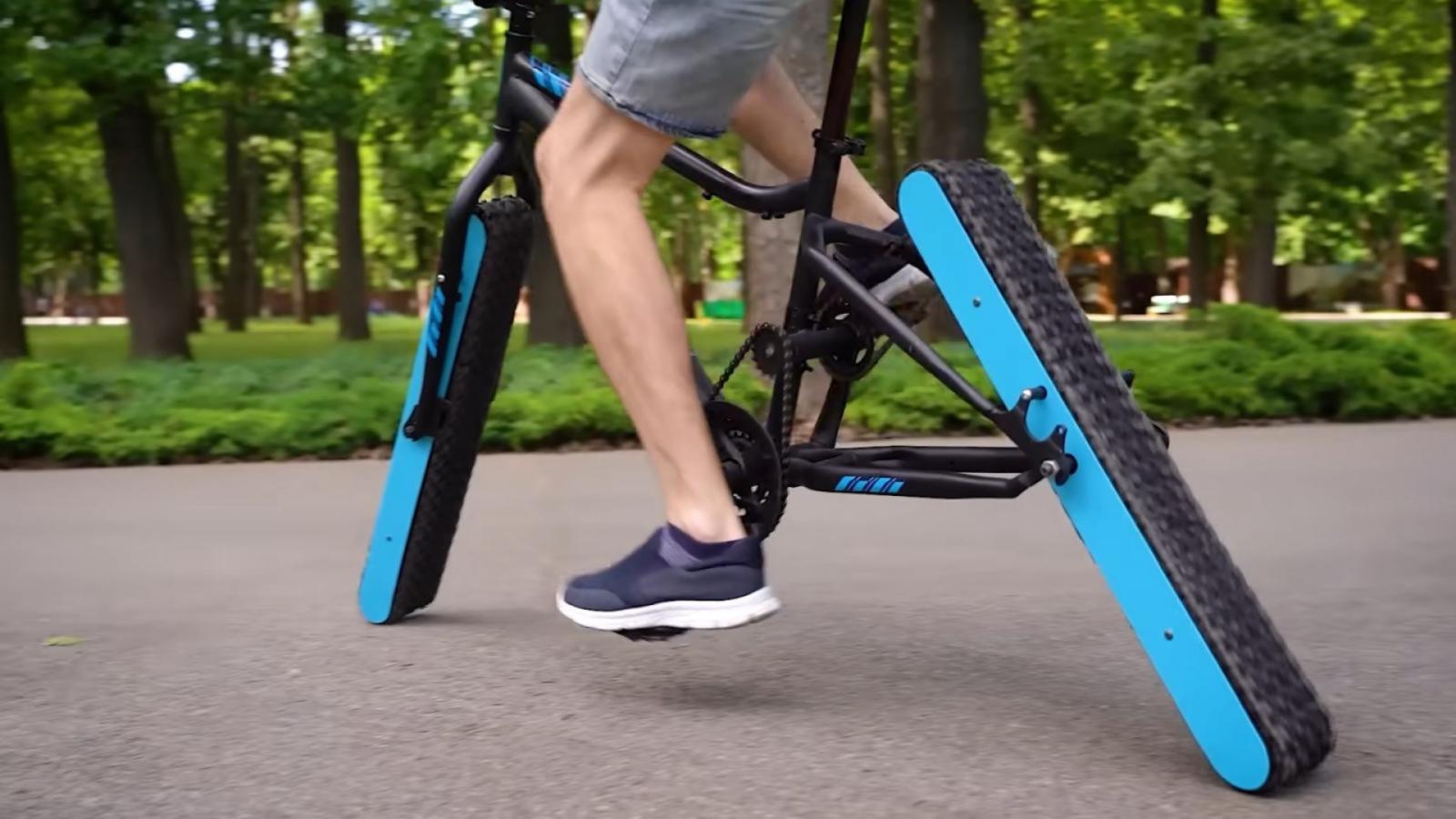 Αντιθέτως, για να μπορέσει να κινήσει το ποδήλατο έχει δημιουργήσει κάποιου είδους ερπύστριες, κατασκευασμένες από ελαστικά, οι οποίες περιβάλλουν δύο μεταλλικές επιφάνειες σε μη συμβατικές γωνίες.