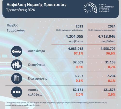 Σύμφωνα με τα επίσημα στοιχεία της Ένωσης Ασφαλιστικών Εταιρειών Ελλάδος (ΕΑΕΕ) ο κλάδος του αυτοκινήτου κατέχει την μερίδα του λέοντος στις ασφάλειες νομικής προστασίας με 4,5 εκατ. συμβόλαια το 2024 και ποσοστό 96,6% και ακολουθούν οι Λοιπές Καλύψεις με 121.876 συμβόλαια και 2,6%, η Οικογένεια με 31.159 συμβόλαια και 0,7% και οι Επιχειρήσεις με 7.204 συμβόλαια και 0,1%.