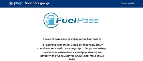 Την Μεγάλη Δευτέρα 6 Απριλίου ανοίγει η πλατφόρμα κατάθεσης αίτησης για το Fuel Pass III, το οποίο αποτελεί ένα μέτρο ενίσχυσης για την κάλυψη του κόστους κατανάλωσης και μετακίνησης για τους μήνες Απρίλιο και Μάιο έτους 2026.