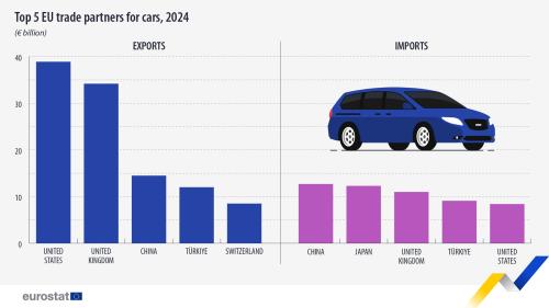 Όσον αφορά τις εισαγωγές αυτοκινήτων στην ΕΕ, η Κίνα και η Ιαπωνία ήταν οι μεγαλύτεροι προμηθευτές, με 12,7 δισ. ευρώ και 12,3 δισ. ευρώ, αντίστοιχα. Το Ηνωμένο Βασίλειο ήρθε τρίτο με 11,0 δισ. ευρώ, ακολουθούμενο από την Τουρκία με 9,1 δισ. ευρώ και τις Ηνωμένες Πολιτείες με 8,4 δισ. ευρώ.