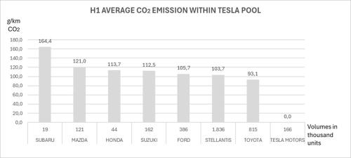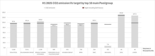 Η ομάδα της Tesla, η οποία περιλαμβάνει μερικούς από τους μεγαλύτερους κατασκευαστές αυτοκινήτων στην Ευρώπη, αντιπροσώπευε πάνω από 3,5 εκατομμύρια ταξινομημένα οχήματα στο πρώτο εξάμηνο του 2025. Παρά την πλήρως ηλεκτρική γκάμα της Tesla και την ισχυρή υβριδική στρατηγική της Toyota, η ομάδα εξακολουθεί να είναι 1,4g/km πάνω από τον στόχο της. Αυτό το έλλειμμα οφείλεται σε μεγάλο βαθμό στην Stellantis, η οποία από μόνη της αντιπροσωπεύει το 51% του όγκου της ομάδας.