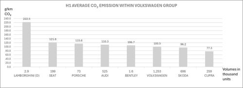 Παρόμοια κατάσταση παρατηρείται και με τον Όμιλο Volkswagen, όπου μόνο η Cupra βρίσκεται σημαντικά κάτω από τον στόχο για τις εκπομπές CO2. Ο όμιλος δεν έχει ακόμη συνεργαστεί με άλλους κατασκευαστές για να μειώσει τις εκπομπές CO2, οι οποίες είναι 5,6 g/km πάνω από τον στόχο. Αυτή η υπέρβαση των εκπομπών CO2 θα μπορούσε να οδηγήσει σε πρόστιμο άνω των 3 δισεκατομμυρίων ευρώ από την Ευρωπαϊκή Επιτροπή μέχρι το τέλος του έτους, εάν η πορεία των πωλήσεων παραμείνει αδιάφορη.