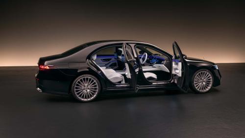 Οι λεπτομέρειες χρωμίου συνεχίζονται χαμηλά στον προφυλακτήρα, πλαισιώνοντας τις διπλές απολήξεις της εξάτμισης. Το προφίλ παραμένει κλασικά S-Class, με μεγάλες γυάλινες επιφάνειας περιμετρικά της καμπίνας και ομαλή γραμμή οροφής που καταλήγει διακριτικά στο πίσω μέρος. Οι στάνταρ ζάντες 19 ιντσών συμπληρώνουν την εικόνα πολυτέλειας.