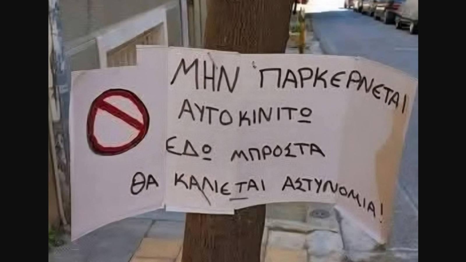 Όπως μπορείτε να δείτε, η εικόνα προέρχεται από αστικό δρόμο, όπου ένας αγανακτισμένος περαστικός αποφάσισε να ενημερώσει τους οδηγούς πως στο σημείο δεν επιτρέπεται η στάθμευση, αφήνοντας ένα χειρόγραφο σημείωμα κολλημένο σε κολόνα, συνοδευόμενο μάλιστα και από το κλασικό σύμβολο «απαγορεύεται».
