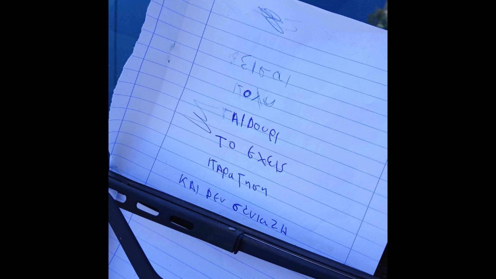 Το παράνομο παρκάρισμα είναι μία από τις «πληγές» της καθημερινότητας τόσο των οδηγών όσο και των πεζών στα αστικά κέντρα, με πολλούς να αποφασίζουν να εκφράσουν την αγανάκτησή τους γραπτώς, αφήνοντας δηλαδή ένα χειρόγραφο σημείωμα μεταξύ παρμπρίζ και υαλοκαθαριστήρα.