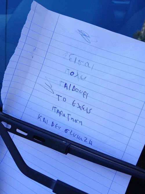 Τα σημειώματα στο παρμπρίζ των παράνομα σταθμευμένων αυτοκινήτων κάνουν πλέον «καριέρα» στην ελληνική όχθη των μέσων κοινωνικής δικτύωσης, με ένα από τα πιο πρόσφατα παραδείγματα να διακρίνεται και για την ανορθογραφία του.