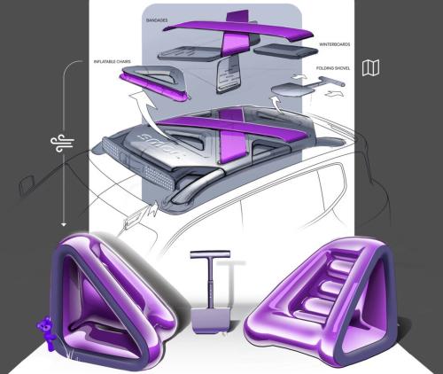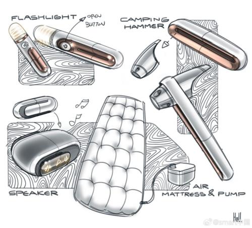 Παράλληλα, το target group για αυτό το μοντέλο, μαρτυρούν τα σκίτσα με αξεσουάρ που σχετίζονται με το κάμπινγκ, όπως ένα φουσκωτό στρώμα, εργαλεία, ένας φακός κι ένα φορητό ηχείο.