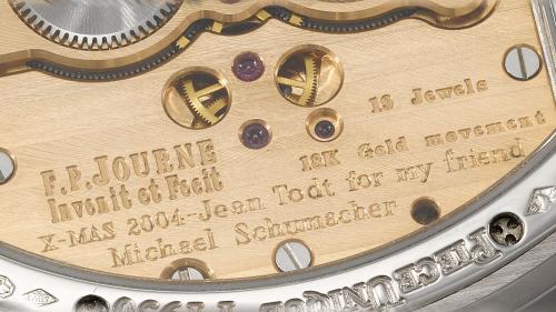 Η δημοπρασία θα πραγματοποιηθεί στη Γενεύη τον επόμενο μήνα και θα περιλαμβάνει ένα ρολόι Platinum Vagabondage 1 που έχει κατασκευαστεί ειδικά για τον Michael μετά από παραγγελία του πρώην αφεντικού του, του Jean Todt, για δώρο Χριστουγέννων το 2004.