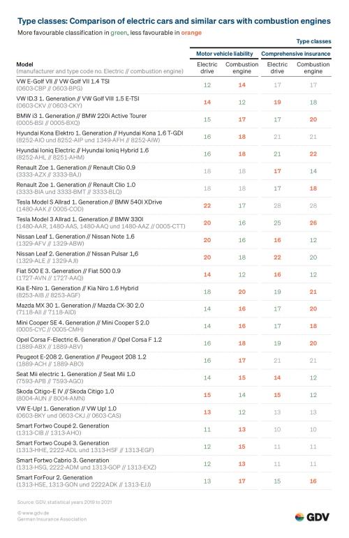 Για την τρέχουσα μελέτη της GDV, σχηματίστηκαν 37 ζεύγη από ηλεκτρικά αυτοκίνητα και αντίστοιχα αυτοκίνητα με κινητήρες εσωτερικής καύσης που ήταν όσο το δυνατόν πιο παρόμοια. Αυτό ήταν εύκολο σε ορισμένες περιπτώσεις γιατί υπήρχαν μοντέλα της ίδιας σχεδίασης, για παράδειγμα το ηλεκτρικό Smart με το Smart ή το ηλεκτρικό Golf VII με το Golf VII. Ήταν πιο δύσκολο για άλλα μοντέλα. Σε τέτοιες περιπτώσεις, οι ειδικοί της GDV βρήκαν κατάλληλα ομότιμα οχήματα. Στη συνέχεια, αξιολόγησαν τον τρόπο με τον οποίο αναπτύχθηκε η συχνότητα και το ύψος των αποζημιώσεων τόσο στην αστική ευθύνη των αυτοκινήτων όσο και στην ολοκληρωμένη ασφάλιση σε διάστημα τριών ετών.