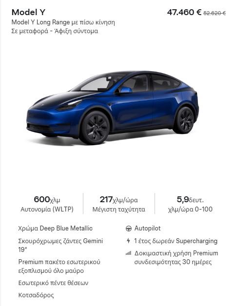 Εξίσου υψηλή είναι η μείωση στην τιμή (από 53.470 ευρώ σε 48.220 ευρώ) και σε ένα ακόμη Model Y Long Range που αναμένεται να αφιχθεί σύντομα στην Ελλάδα και φέρει το χρώμα Solid Black, όπως και σε ένα ακόμα αυτοκίνητο, στην ίδια έκδοση, το οποίο φέρει το χρώμα Quicksilver και διατίθεται από τα 53.920 ευρώ στα 48.630.