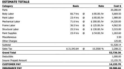 Σημειώνεται, πως ακόμη και με την εκτεταμένη ασφαλιστική κάλυψη που διέθετε ο ιδιοκτήτης, η ασφαλιστική δεν επωμίστηκε όλο το ποσό, άλλα κατέβαλε 39.580 δολάρια από το συνολικό κόστος, με τον οδηγό να επιβαρύνεται προσωπικά με 14.156 δολάρια.