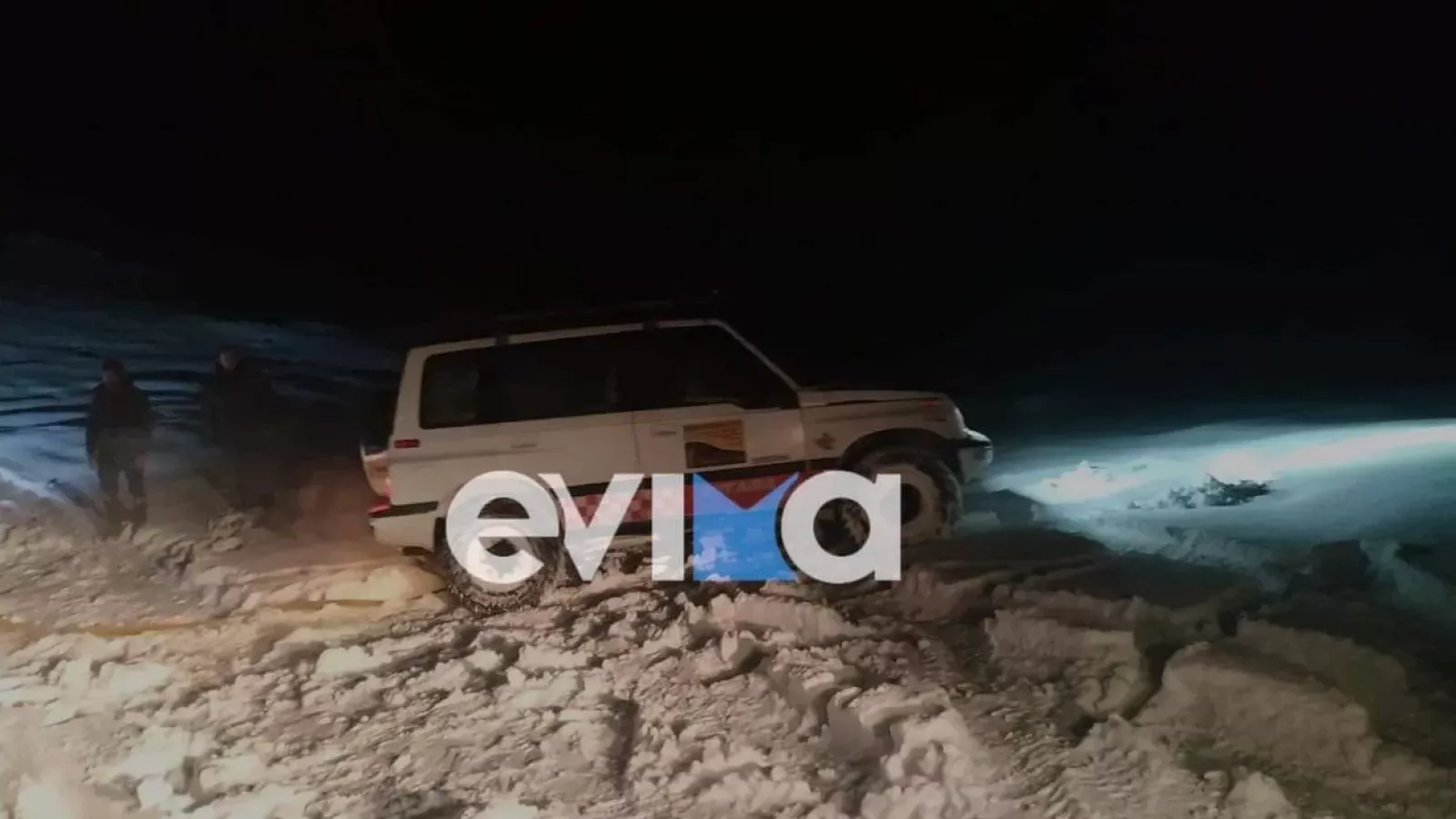 Σε δύσβατη περιοχή στην Εύβοια εγκλωβίστηκε λόγω της πυκνής χιονόπτωσης παρέα νεαρών με το SUV όχημά τους.