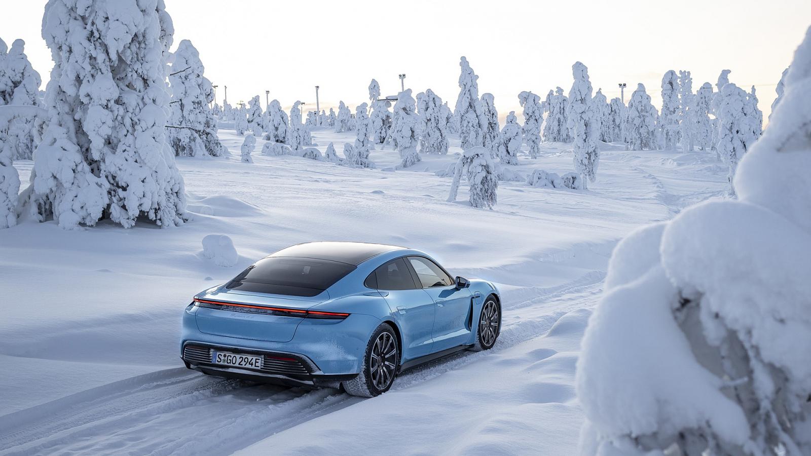 Από την άλλη, μία Porsche Taycan να «χορεύει» στο λευκό σκηνικό, κάνοντας ντόνατ στο χιόνι αλλά και στο δρόμο, επιδεικνύοντας πως ξέρει κι αυτή, εκτός από γρήγορα, να κινείται και με χάρη.